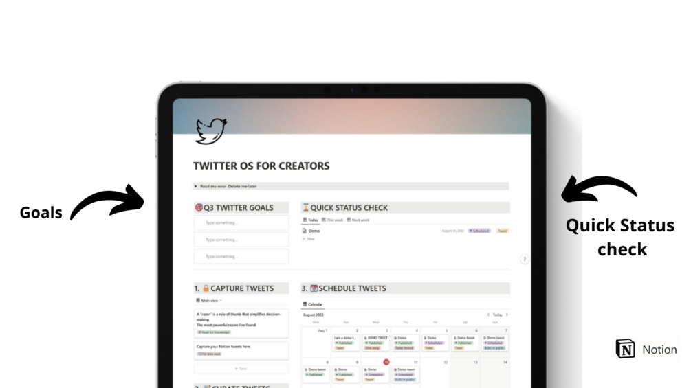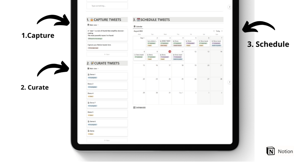 - CAPTURE TWEETS - This section lets you store any information you read online. blogs, tweets, newsletters, etc. Saving this information serves many purposes. I believe you create what you consume so this helps you to find inspiration to create your content, so, you will never run out of ideas.